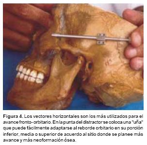 Para los avances frontoorbitarios el vector distraccional más utilizado es el tipo horizontal. En estos casos la osteotomía incluye el hueso frontal y la órbita hasta su ángulo inferoexterno. Aquí el distractor idealmente se apoya 5 mm., por encima del reborde orbitario superior a fin de lograr más avance de la frente y un avance gradual de la órbita (Figura 4). Para los avances en las osteotomías tipo monobloque, se utilizan dos pares de distractores: