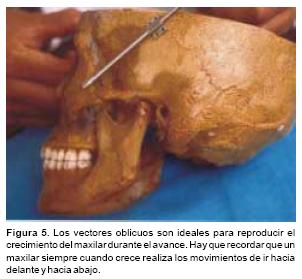 a Los que avanzan el tercio medio de la cara, que generalmente utilizan un vector distraccional oblicuo, de arriba hacia abajo (Figura 5). El distractor se apoya en la unión de la órbita y el hueso malar, o en la cara posterior del malar. Esta dirección de distracción avanza el maxilar, los malares y la mitad inferior de las órbitas recreando la curva de crecimiento, que el tercio medio de la cara normalmente realiza durante el desarrollo y evita la producción de alteraciones oclusales como las graves mordidas abiertas anteriores u otras, b Los que avanzan el hueso frontal y el reborde supraorbitario, son un par de distractores que tienen un vector horizontal. Especialmente en niños con edades entre los 9 y los 14 meses durante el avance, es importante evitar la fractura de la unión frontoorbitaria, debido a que ésta es una unión ósea muy lábil en estas edades y la fuerza producida por estos distractores durante su activación puede producir fácilmente esta fractura.