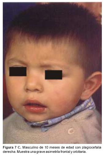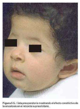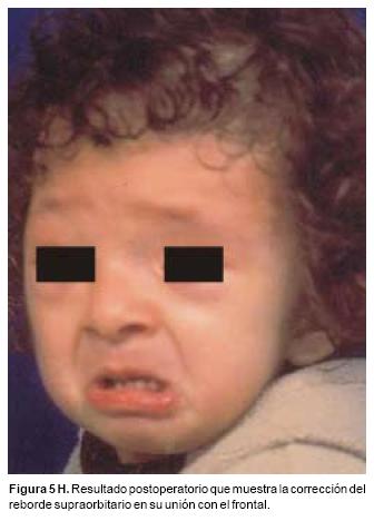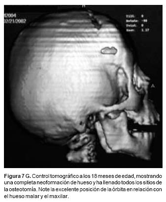 También los controles radiológicos durante el proceso de distracción mostraron que no se produjo la creación de espacios muertos intracraneanos durante los avances. En todos los pacientes con sinostosis bicoronal el avance frontoorbitario produjo excelentes resultados estéticos dando una nueva forma a la región frontal y proyectando mejor el reborde supraorbitario. En los niños con enfermedad de Crouzon y síndrome de Apert, se corrigió en forma muy satisfactoria el exorbitismo al resolver las graves exposiciones corneales (Figuras 5 A, B, C, D, E, F, G, H), en los que se utilizó el avance simultáneo del tercio medio, este cambio óseo corrigió muy satisfactoriamente la retrusión del mismo, ampliando la vía aérea y resolviendo en muchos casos grandes problemas ventilatorios durante el sueño (Figuras 6 A, B, C, D, E, F). Los pacientes con plagiocefalia corrigieron significativamente la deformidad frontoorbitaria y los tejidos blandos suprayacentes se adaptaron a la nueva estructura ósea. La clásica órbita de arlequín de estos niños producida por la sinostosis del frontal con el esfenoides, inmediatamente se ve corregida en su forma y su configuración se hace muy similar con la órbita contralateral (Figura 7)(Fig. 7a, 7b, 7c, 7d, 7e, 7f, 7g) (Cuadro II).