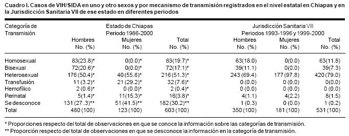 No obstante lo anterior, es necesario analizar con mayor detalle estos resultados del sistema de vigilancia epidemiológica de casos de VIH/SIDA. En el cuadro I se observa discordancia entre el total de casos de VIH/SIDA reportados en el nivel estatal en Chiapas y los reportados en el nivel regional en el Soconusco. En esta región se obtuvo información solamente para los años 19931996 y 19992000 en los que se reportaron 531 casos. Por su parte en el nivel estatal se notificaron 603 casos consecutivamente entre 1986 y 2000. Los casos de VIH/SIDA en el Soconusco, en los años señalados fueron 44, 77, 90 76, 101 y 143, respectivamente. Estos resultados indican la existencia de un importante subregistro de casos en el sistema de vigilancia epidemiológica en la región del Soconusco en el estado de Chiapas pues no existe información que indique el número de casos que se reportaron en los periodos 19861992 y 19971998.