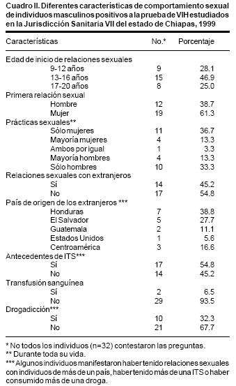 Métodos: Se utilizaron las bases de datos con los registros de los casos de VIH/SIDA para el estado de Chiapas y para la región del Soconusco. En esta región 32 individuos masculinos registrados previamente como seropositivos al VIH por la SSA contestaron un cuestionario que indagaba sobre sus características sociodemográficas y su comportamiento sexual. Todos proporcionaron una muestra de sangre para la identificación de anticuerpos contra el VIH a través de dos pruebas de tamizaje, por ELISA y por microaglutinación, más una confirmatoria por Western blot.