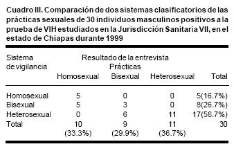En el nivel estatal en Chiapas el principal mecanismo notificado de transmisión del VIH es el heterosexual en uno y otro sexos con 51.3% y de 79% en la región del Soconusco (Cuadro I). Si sólo consideramos a los hombres, las frecuencias respectivas fueron de 50.4% y de 69.4%. Si sumamos las categorías de transmisión bisexual y homosexual evaluando exclusivamente a los hombres, encontramos una frecuencia de 44.4% en el nivel estatal en Chiapas y de 29.1% en la región del Soconusco. De 32 individuos entrevistados 75% refirió haber iniciado su vida sexual antes de los 17 años y 37.5% habían tenido su primer relación sexual con un hombre (Cuadro II). Los individuos que iniciaron su vida sexual con un hombre lo hicieron a más temprana edad que aquellos que la iniciaron con una mujer 7 vs. 1 en el grupo de 912 años; 5 vs. 10 en el grupo de 13 a 16 años; y 0 vs. 8 en el grupo de 1720 años (un participante no dio respuesta en este sentido). Del total de individuos entrevistados, 11 refirieron haber tenido, durante toda su vida, relaciones sexuales únicamente con mujeres práctica heterosexual (36.7%), mientras que 10 (33.3%) dijeron tenerlas exclusivamente con hombres práctica homosexual y el resto (n=9, 29.9%) tuvo diferentes gradientes de relaciones sexuales tanto con hombres como con mujeres práctica bisexual (dos sujetos no contestaron a la pregunta) (Cuadro II). En contraste, de esos 30 individuos arriba referidos, 17 (56%), 8 (26.6%) y 5 (16.6%), habían sido clasificados, por el sistema de vigilancia epidemiológica de la jurisdicción Sanitaria VIII, en las categorías <<heterosexual>>, <<bisexual>> y <<homosexual>> respectivamente. En el cuadro III se observa que de 10 individuos clasificados (en la entrevista) con prácticas homosexuales, sólo 5 lo fueron clasificados en esa categoría por el sistema de vigilancia de la Jurisdicción Sanitaria VII y los otros 5 fueron clasificados por este sistema, con prácticas bisexuales. Asimismo, de 9 individuos clasificados en la entrevista con prácticas bisexuales, sólo 3 lo fueron por el sistema de vigilancia ya mencionado y los otros 6 fueron clasificados con comportamiento heterosexual. En cambio, de 11 individuos clasificados por la entrevista con prácticas heterosexuales, esos mismos fueron también clasificados con prácticas heterosexuales por el sistema de vigilancia epidemiológica del VIH/SIDA arriba mencionado. Los dos individuos que en la entrevista no proporcionaron información sobre sus prácticas sexuales fueron clasificados por el programa de vigilancia epidemiológica en la categoría homosexual.