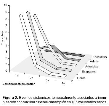 Los eventos locales temporalmente asociados a la inmunización (dolor, calor, rubor y/o induración) han sido informados en el de 5 al 15%,10 mientras que los sistémicos ocurren con la siguiente frecuencia: fiebre (515%), exantema (15%), artralgias transitorias (025%), artritis transitoria (20%) y encefalitis (1 en 1'000,000 de vacunados).9