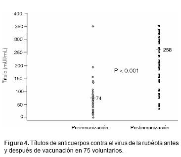 Seroprevalencia y desarrollo de anticuerpos contra el virus del sarampión y de la rubéola. De los 105 voluntarios en los que pudo darse completo seguimiento durante las cuatro semanas, en 75 de ellos se obtuvieron muestras pareadas de suero antes y seis semanas después de la vacunación. El porcentaje de voluntarios con anticuerpos contra sarampión en el suero antes y después de la inmunización fue de 90.7 y 100%, respectivamente. El porcentaje de voluntarios con anticuerpos contra rubéola antes y después de su inmunización fue de 94.7 y 100%, respectivamente.