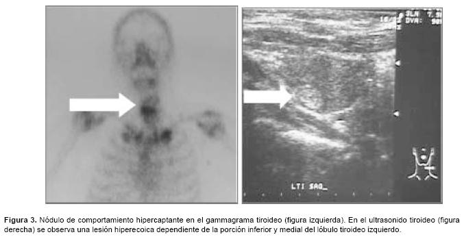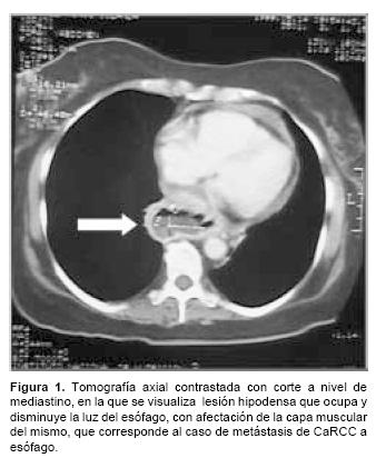De acuerdo con estos criterios se incluyeron un total de 11 casos (que representó 8% del total de pacientes con CaRCC tratados inicialmente como localizados al riñón en el Instituto), con distribución por sexo de 7 hombres y 4 mujeres, y edades que variaron de 42 a 77 años (promedio de 54.8 años). Todos los casos fueron diagnosticados inicialmente como cáncer renal localizado y sometidos a nefrectomía radical. El informe histopatológico correspondió a CaRCC de patrón histológico convencional, con grados de diferenciación de Furhman de II a IV, clasificados por el sistema TNM al inicio como enfermedad organoconfinada (T2), y en los que posteriormente se detectó la presencia de metástasis únicas en órganos diferentes a pulmón, hueso o hígado por ser los sitios más frecuentes de progresión. Los sitios de diseminación inusuales fueron: un caso de esófago (Figura 1), tejidos blandos de rodilla (Figura 2), amígdala, diafragma, testículo, tiroides (Figura 3) y suprarrenal; y dos casos a cerebro y a duodeno. El tiempo entre la nefrectomía y la presentación de la metástasis varió de 9 hasta 156 meses. El estudio histopatológico confirmó el diagnóstico en todos los casos y fueron sometidos a resección de la lesión. (Cuadro I)