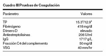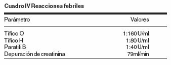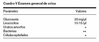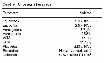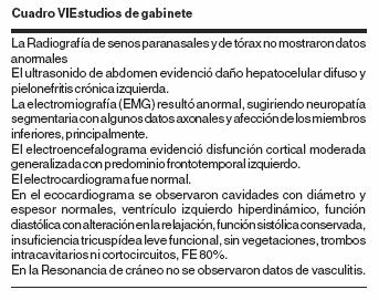 La exploración física reveló TA 110/80, temperatura de 37.8°C, adecuada hidratación, faringe ligeramente hiperémica y cuello sin crecimientos ganglionares. Los campos pulmonares presentaban murmullo vesicular normal y los ruidos cardiacos eran rítmicos de intensidad normal. El abdomen era globoso a expensas de panículo adiposo, blando, depresible, no doloroso y sin visceromegalias a la palpación. Las extremidades presentaban disminución de la fuerza muscular en miembros inferiores (3/5) y edema maleolar (+). El llenado capilar era de 2". El resultado de los estudios del laboratorio practicados se presentan en los cuadros I al V (cuadro 1, 2, 3, 4 y 5) y los estudios de gabinete en el cuadro VI.
