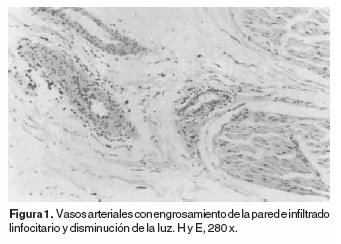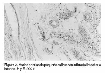 Se consideró la posibilidad de un proceso infeccioso, como causa del cuadro clínico, la cual fue descartada. Se evidenciaron alteraciones electroencefalográficas y la neuropatía se corroboró mediante EMG. Finalmente, el diagnóstico se realizó mediante biopsia de nervio sural, en el que se observaron arterias de mediano y pequeño calibre afectadas por infiltrado linfocitario característico: Figuras 1 y 2.
