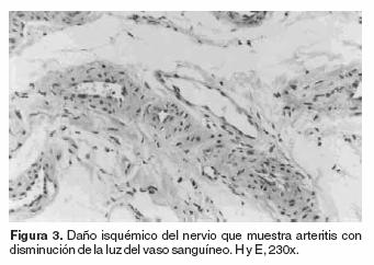 Los hallazgos histopatológicos fueron los siguientes: la biopsia de músculo no mostró alteraciones, en tanto que la biopsia de nervio sural informó poliarteritis nodosa (PAN), con zonas isquémicas (multiinfartos microscópicos).