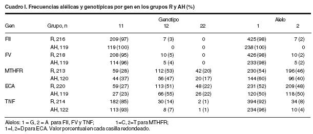 Las distribuciones genotípicas en el grupo de referencia estuvieron concordantes (p > 0.1) con las predichas por la ley de HardyWeinberg (HW). En el grupo AH no hubo diferencias significativas entre mujeres y varones en los cinco marcadores, por lo que se sumaron los datos de ambos sexos y se analizaron en conjunto. Los genotipos para cada uno de los polimorfismos y las frecuencias alélicas y genotípicas se muestran en el cuadro I.