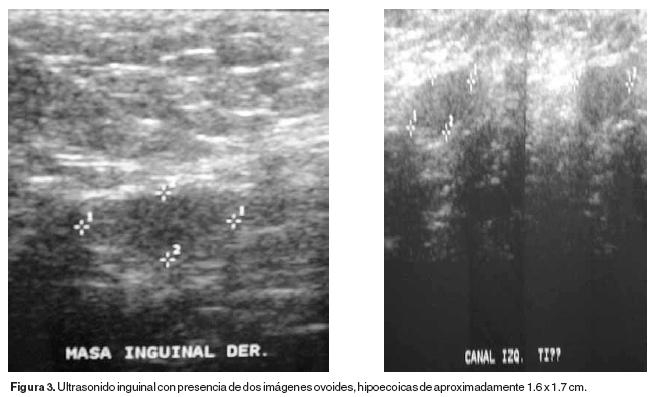 El ultrasonido inguinal confirmó ausencia de testículos en bolsas escrotales y en regiones inguinales presencia de imagen ovoide hipoecoica de 1.6 x 1.7cm (Figura 3). En la densitometría ósea se detectó osteoporosis.