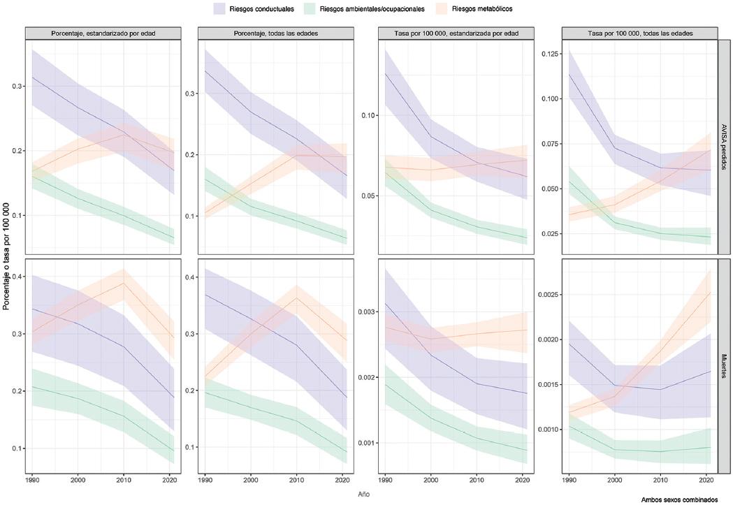Figura 1 Mortalidad y años de vida saludable (AVISA) perdidos atribuibles a los factores de riesgo en México de 1990 a 2021. Datos presentados en porcentajes y tasas crudas (todas las edades) y ajustadas por edad por 100 000 habitantes. Factores de riesgo desagregados a nivel 1.