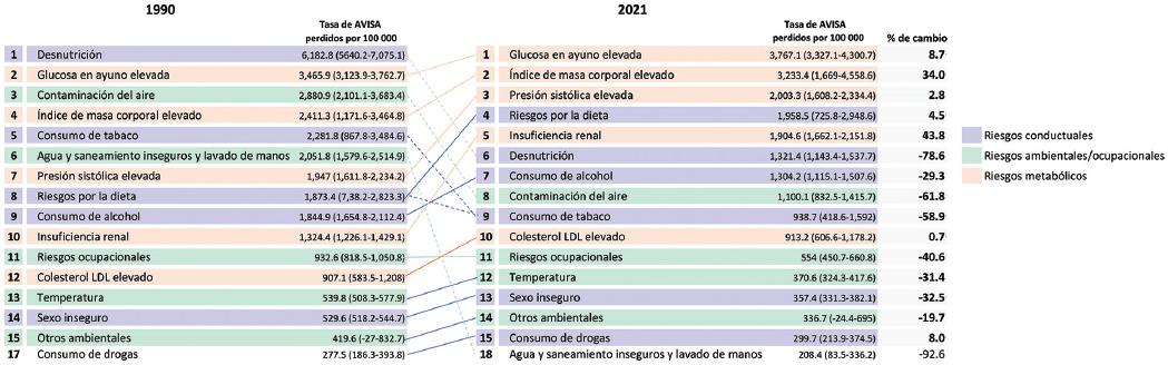 Figura 2 Principales factores de riesgo de años de vida saludable (AVISA) perdidos en México en 1990 y 2021. Factores de riesgo ordenados por la tasa de AVISA perdidos ajustada por edad por 100 000 habitantes, ambos sexos. Factores de riesgo desagregados a nivel 2.