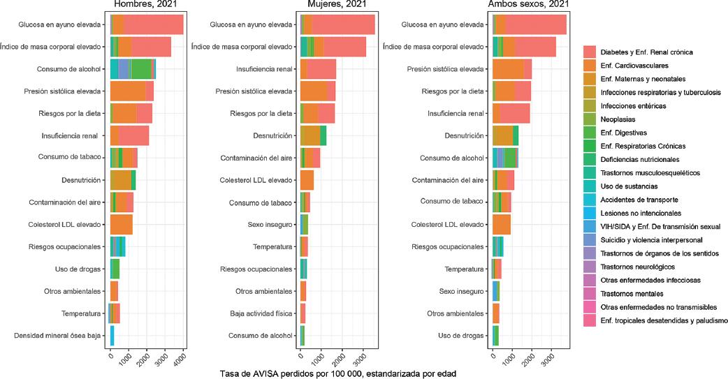 Figura 3 Años de vida saludable (AVISA) perdidos atribuibles a los factores de riesgo en hombres, mujeres y ambos sexos en México en 2021. Factores de riesgo ordenados por la tasa de AVISA perdidos ajustada por edad por 100,000 habitantes. Factores de riesgo y causas de enfermedad desagregados a nivel 2.