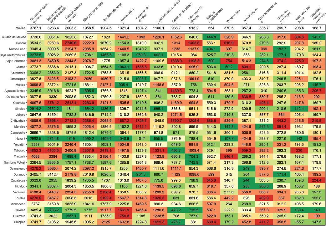 Figura 4 Principales factores de riesgo de años de vida saludable (AVISA) perdidos en México en 2021. Datos presentados en tasa de AVISA perdidos ajustada por edad por 100 000 habitantes, ambos sexos. Estados de la República Mexicana ordenados por índice sociodemográfico; el rojo indica la tasa más alta y el verde, la tasa más baja. Factores de riesgo desagregados a nivel 2.