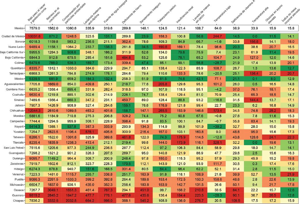 Figura 5 Principales factores de riesgo de años de vida saludable (AVISA) perdidos en menores de cinco años en México en 2021. Datos presentados en tasa de AVISA perdidos por 100 000 habitantes, ambos sexos. Estados de la República Mexicana ordenados por índice sociodemográfico; el rojo indica la tasa más alta y el verde, la tasa más baja. Factores de riesgo desagregados a niveles 2 y 3.