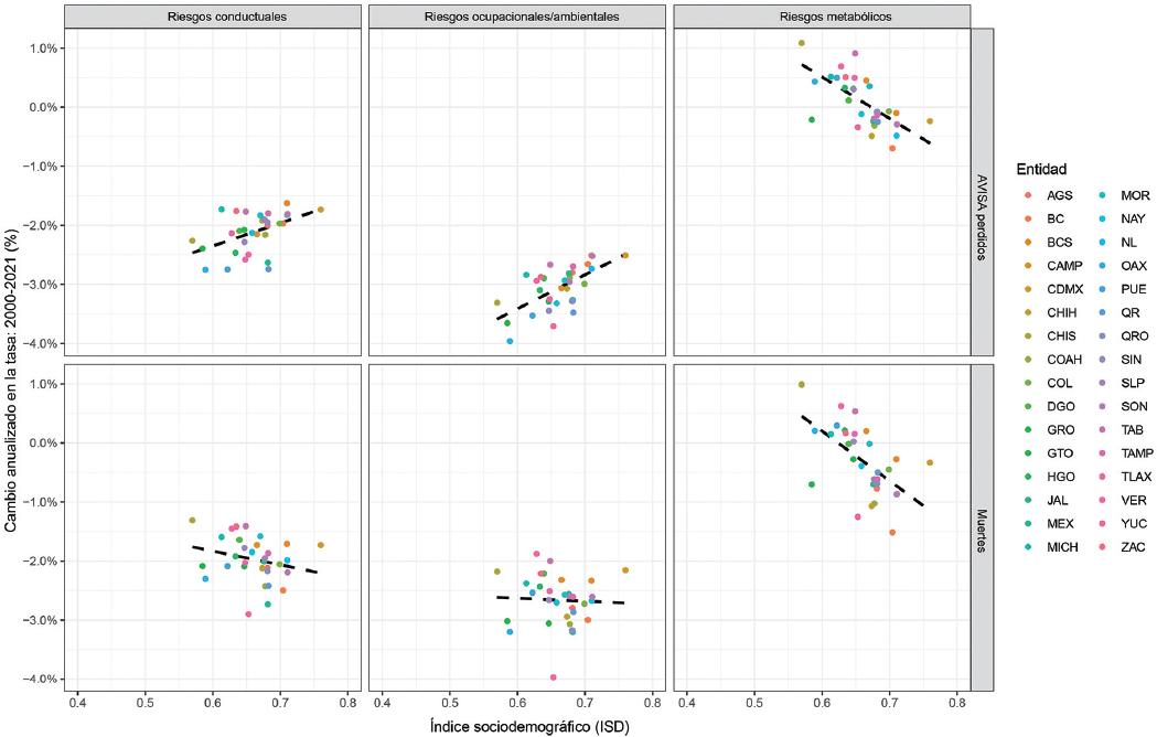 La Figura 6 ilustra la relación entre la tasa de cambio anualizada en las tasas de mortalidad estandarizadas, los AVISA perdidos de 2000 a 2021 (eje vertical) y el ISD (eje horizontal) en las entidades federativas. En los estados con un ISD más bajo se observó una reducción más rápida de la mortalidad y los AVISA perdidos asociados a riesgos ambientales, ocupacionales y conductuales. Sin embargo, en cuanto a los riesgos metabólicos, la tendencia fue inversamente proporcional al ISD: incremento en los estados con un ISD más bajo y disminución en aquellos con el ISD más alto.