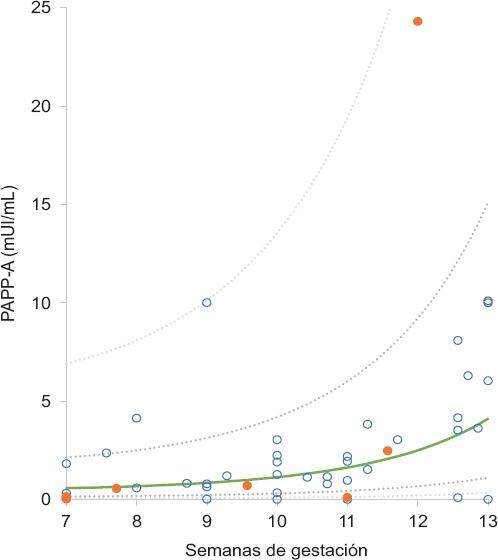 Figura 1 Gráfico de dispersión de la concentración sérica de la proteína plasmática A asociada al embarazo (PAPP-A), según la semana de gestación en que se midió en cada embarazo con preeclampsia (punto naranja) y sin preeclampsia (círculo azul); así como la mediana de referencia obtenida de la muestra poblacional (línea verde) y los percentiles 10, 25, 75 y 90 (líneas grises).