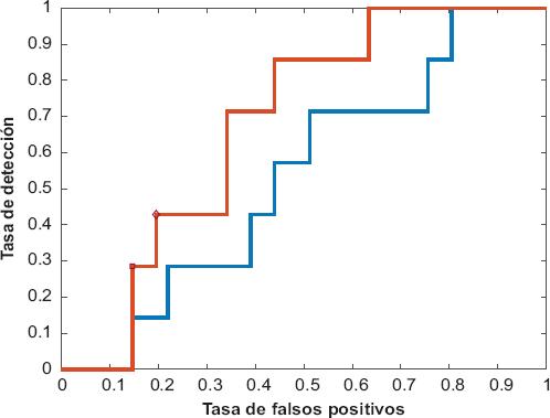 Figura 2 Áreas bajo las curvas de la característica operativa del receptor para la proteína plasmática A asociada al embarazo (PAPP-A), medida en el primer trimestre de la gestación como prueba discriminante para predecir parto con preeclampsia, según los múltiplos de la mediana (MoM) por valores de referencia locales (véase Figura 1), transformados a razones de verosimilitud positiva (LR) por un algoritmo predefinido adaptado desde una calculadora externa3 (https://doi.org/10.6084/m9.figshare.23304221.v1); el escenario fue preeclampsia antes de las 37 semanas (línea roja). Con una tasa de 20 % de resultados falsos positivos, la tasa de detección fue de 43 %, para una LR = 3.5 (rombo rojo); a 15 % de resultados falsos positivos, la tasa de detección fue de 29 % para una LR = 46.1 (cuadrado rojo). Adicionalmente se grafica el desempeño para el algoritmo en su formato original3 (línea azul).