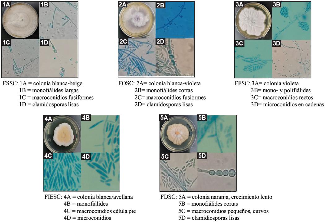 Figura 1 Características fenotípicas de los complejos de Fusarium identificadas en este estudio. Aumento de 400×.