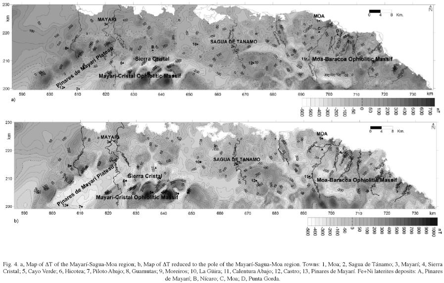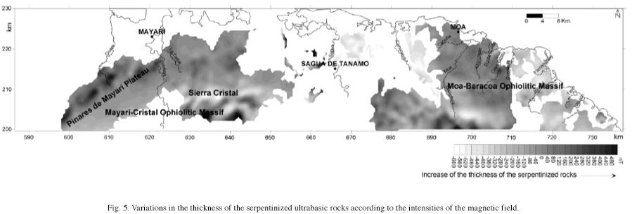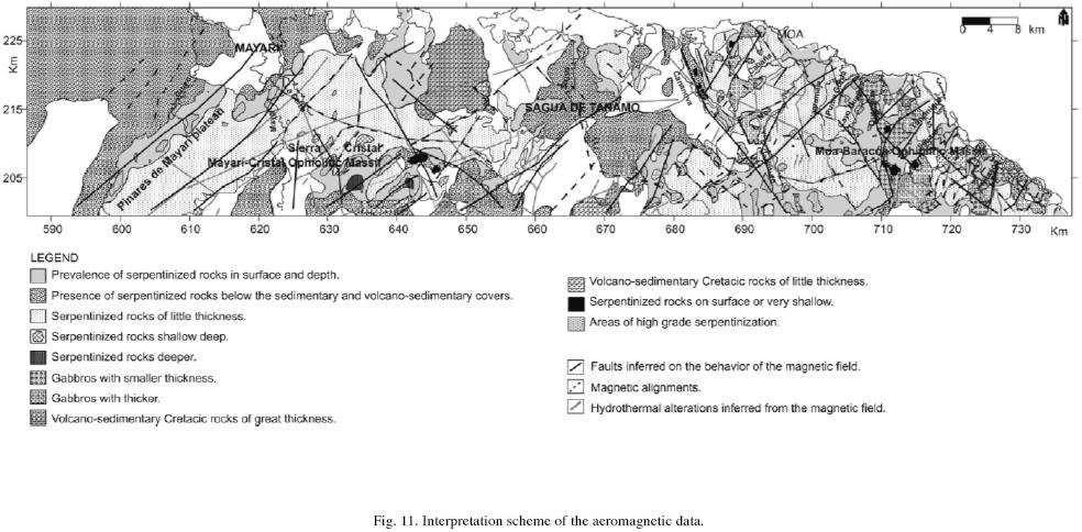 Variations in thickness and lithology, of the two fundamental levels of the ophiolitic section defined the basement. Areas were also defined where the Cretaceous volcanosedimentary rocks over on serpentinized peridotites. The high intensities of the magnetic field suggest that south of the Sierra Cristal the serpentinized rocks reach their maximum thickness or present a magnetic metamorphic basement near the surface. To corroborate this idea, detailed studies or deeper drilling in the region would be necessary. On lateritic deposits the magnetic field presents negative values, suggesting thin serpentinitic bodies in outlying areas of the ophiolitic massif or where a tectonic horst has caused the erosion of the cover. Lengthened anomalous areas, aligned anomalies and high gradients are reflected in the magnetic field.