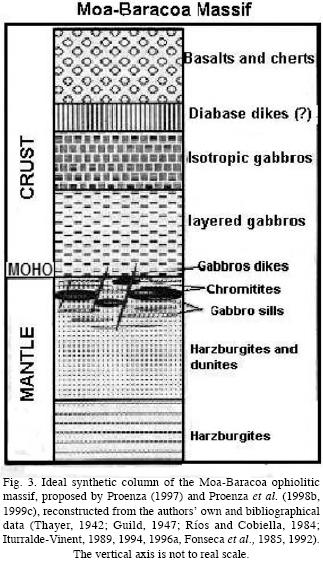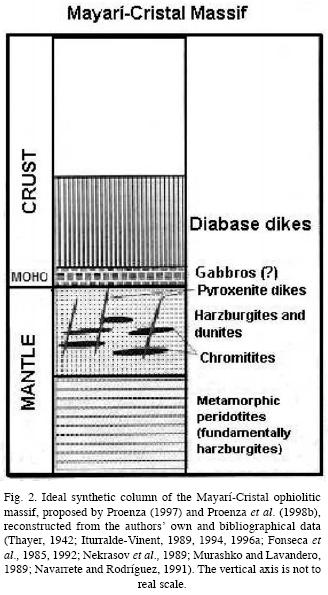 In the synthetic column of this massif (Figure 3), proposed by Proenza (1997) and Proenza et al. (1998b, 1999c), we have from bottom to top levels: a) a harzburgite area with tectonite textures; b) a harzburgite area that contains bodies of dunites, plagioclase dunites, gabbro sills, gabbro dike and pegmatitic gabbro; c) the area of gabbros, which present at the base great development of crossed gabbros (olivine gabbros, gabbronorites), grading upward into isotropic gabbros; d) the area of the complex of diabase dikes?, and e) the effusivesedimentary complex.