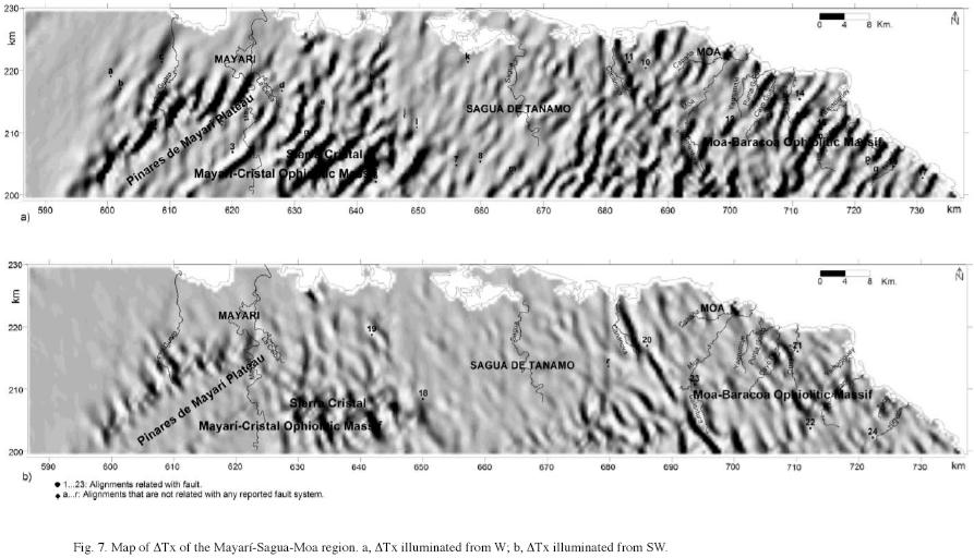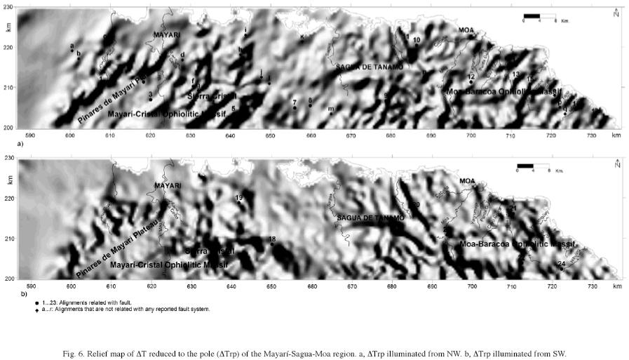 In the contour and relief maps of ΔTrp (Figure 4 and 6) and of the horizontal gradients (Figure 7 and 8), we find anomalous areas with northeast and northwest direction, which could be related to the main fault systems in the region (Figure 1), in agreement with Naidu and Mathew (1998), in a different region of the world. The high gradients observed in areas of change of polarity of the magnetic field, suggest abrupt contacts between the geologic bodies. The aligned areas that show positive values of the field are indicative of an increment of magnetization, caused in ultrabasic rocks, by an increase of serpentinization or the existence at depth of serpentinitic peridotites, according to work carried out in the study region (Chang et al., 1990, 1991; Batista, 1998; Batista and Rodríguez, 2000; Batista et al., 2002) and in other parts of the world (Best et al., 1998; Goussev et al., 1998; Hassan et al., 1998; Peirce et al., 1998). In ophiolites and volcanosedimentary rocks the negative values in the anomalous areas can be related to the existence of hydrothermal alterations (Utada, 1990; Locke et al., 1994; AlvaValdivia et al., 1997; Batista, 1998; Batista and Rodríguez, 2000; AlvaValdivia and UrrutiaFucugauchi, 1998; Chernicoff and Paterlini, 1998) or of less magnetic rocks in the depth (Batista, 1998; Batista and Rodríguez, 2000).
