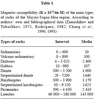 Previous investigations in this and other regions of the world report that inside the ophiolites, the ultrabasic rocks are characterized by the largest magnetic susceptibility (k) variations and can vary from weak until strongly magnetic, in correspondence with their serpentinization level, because during this process the transformation of the olivine or pyroxene to serpentine is produced, being free part of the iron that becomes magnetite. The largest k values are registered in the more serpentinized rocks. The later transformations of these rocks by carbonatization and listvenitization diminish the magnetic susceptibility again; as do the hydrothermal alterations of seritization and quartzification because of alteration of the magnetite and enrichment in silica (Logachev and Zajarov, 1986; Ishihara, 1990, AlvaValdivia et al., 1997; Gunn et al., 1998; García, 1999). The gabbros are weakly or strongly magnetic. Among them, the gabbronorites and anortosites possess the lowest values in k, however, these values increase when they are enriched in magnetite or pyrrhotine.