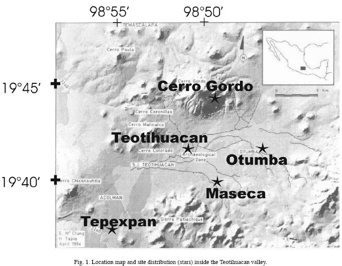 Sampling at Teotihuacan Valley (Figure 1) included sites at different altitudes: the tops of volcanic cones (Cerro Gordo), Patlachique volcano foot hills (Maseca), the border of the ancient Texcoco Xaltocan Lake (Tepexpan); floodplain valley (Otumba) whit clear evidence of human activity; and finally the archeological site Pyramid of the Moon, belonging to Teotihuacan culture.