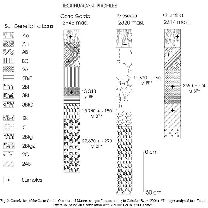 CabadasBáez (2004) and Solleiro et al. (in press) described paleopedological features, such as micromorphology, clay mineralogy and phytolits for the paleosols from Cerro Gordo, Otumba and Maseca profiles (Figure 2). Here we only summarize the main units and their relative ages. Only humus rich A and AB horizons were sampled for the isotopic study.