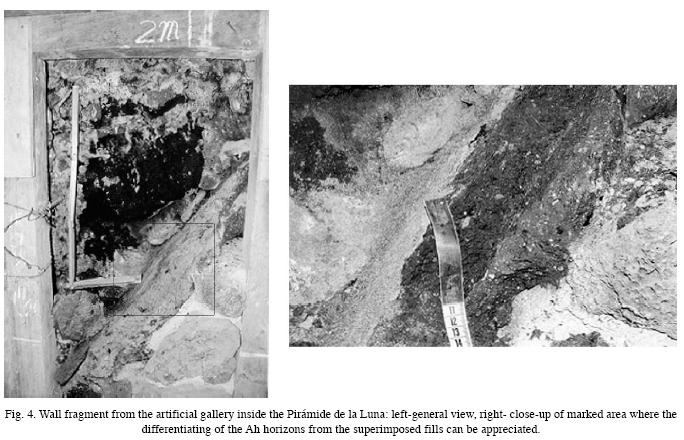 The final site is just inside the gallery, dug recently for archeological research, in the Pyramid of the Moon, one of two main Teotihuacan pyramids in the central part of the valley. The wall cuts, in different parts of the pyramid, display interfaces between at least seven constructions built one on the top of the other at different times between 1800 and 1500 years ago (100450 A.C.) (Sugiyama and Cabrera, 2003). The interface fill has a stratified structure, and is similar to the fill material between stones of the construction. It seems to be a redeposited soil rich in organic matter (Figure 4 a, b). We assume that each fill represents a surface Ahorizon from the surrounding ground and consequently its carbon isotopic composition should reflect the vegetation in Teotihuacan at the time of its construction. We sampled humusrich material from the fills of the superimposed buildings, i.e., the 2nd and 4th ones as classified by archeologists.