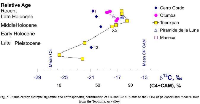 Soils. The δ13Cresults obtained for modern soil samples from the Teotihuacan valley vary among sites by up to 4 %o, confirming the high spatial resolution that can be achieved with isotopic measurements in soils. The difference observed between timeseparated samples is >2 %o and cannot be explained by post formation factors, but instead reflects the primary vegetation buried in the soil. For each soil sample, we estimated the relative proportion (%) of carbon derived from C4+CAM plants.