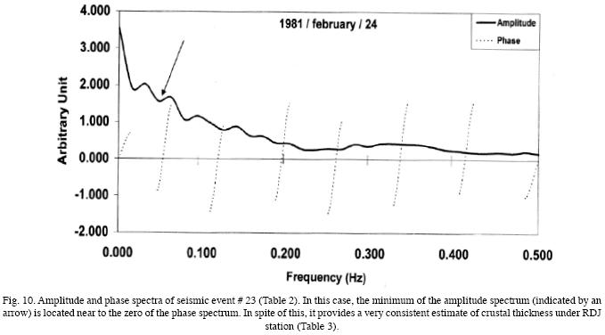 The four parameters f, m, β and θ (equation 1), and the corresponding crustal thickness for the best amplitude and phase spectra are shown in Table 3. We are using two different average shear wave velocities beneath RDJ station, but the difference between both average values is not relevant (