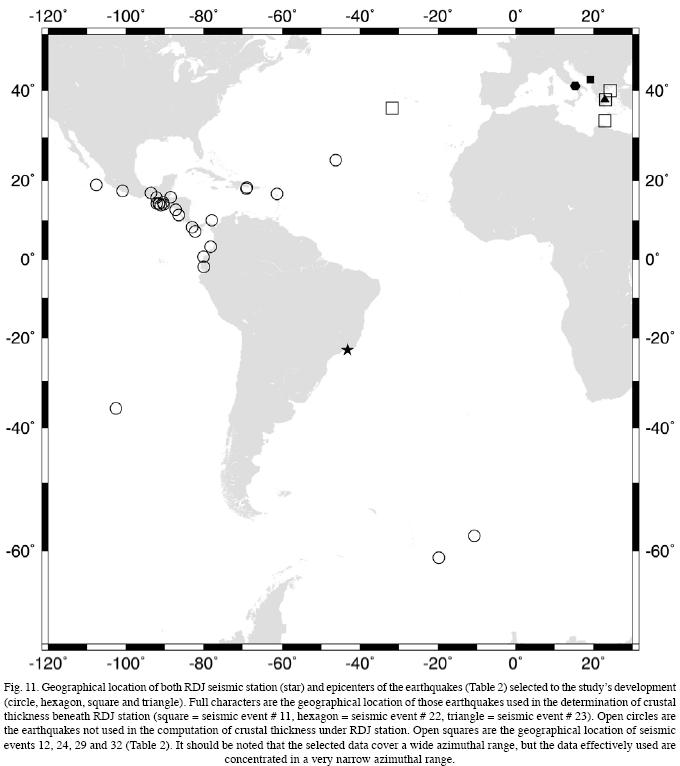 A map with the geographical location of all earthquakes displayed in Table 2 is shown in Figure 11. The data are reasonably well distributed azimuthally, but seismic events 11, 22 and 23 (Table 2) used in the crustal thickness estimate are concentrated in a very narrow azimuthal range. The seismic events with coincidence in amplitude and phase spectra (seismic events 11 and 22 Table 2) have almost the same backazimuth in relation to RDJ station. The seismic event with approximate coincidence in both amplitude and phase spectra (seismic event 23 Table 2) has a backazimuth slightly different from seismic events 11 and 22. Furthermore, it coincides (or it is very close) with those earthquakes whose general characteristics are similar to the seismic events 11 and 22 (seismic events 24, 29 and 32 Table 2), but their amplitude and phase spectra did not present any coincidence. These observations suggest that the likely high S wave velocity layer is not uniformly distributed azimuthally. In conclusion, the existence of a high S wave velocity layer inside the Earth's crust beneath RDJ station, such as observed by surface wave tomography in southeastern Brazil (Pacheco, 2003) and presented in Figure 6, could explain the lack of coincidence in both amplitude and phase spectra of seismic events 12, 24, 29 and 32 (Table 2). The same idea can be applied to explain the approximate coincidence of seismic event 23 (Table 2) and also for explaining the differences in the crustal thicknesses obtained with seismic events 11, 22 and 23 (Table 3). From all estimates of Table 3, an average value of 32.9 km, with a standard deviation of 2.6 km, is obtained for the crustal thickness under RDJ seismic station.