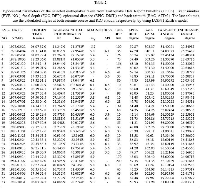 Equation (5) was computationally implemented to calculate an incidence angle at RDJ seismic station. The Earth model used in the incidence's angle computation was IASP91 (Kennett and Engdahl, 1991). The estimated angles of incidence at the base of the crust under RDJ station are displayed in Table 2.