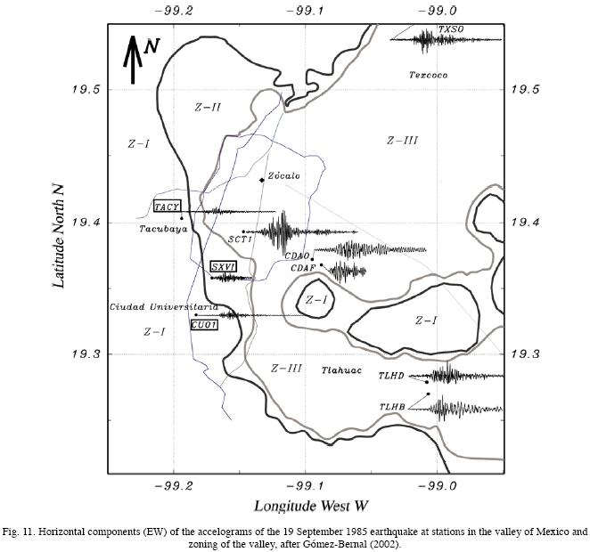 Earthquake observations in the valley of Mexico go back to the Aztecs (García Acosta and Suárez Reynoso, 1996). Here we discuss some modern observations of Rayleigh waves, especially those with prograde ground motion. Engineering seismologists still disagree on whether Rayleigh waves or shear waves are mainly responsible for the severe damage, especially in the disastrous earthquake of 19 September 1985 in Mexico City. There are suggestions that prograde Rayleigh motion may be especially hazardous for buildings (Lomnitz and Meas, 2004). The literature about destructive seismic motion in the valley of Mexico is very substantial. Some recent references include ChávezGarcía and Bard (1994), CárdenasSoto and ChávezGarcía (2006), Lomnitz and Castaños (2006), and FloresEstrella et al. (2006). GómezBernal and Saragoni (1998) observed Rayleigh waves with retrograde motion in different period ranges in the valley, and the dissertation by GómezBernal (2002) contains specific evidence on the 1985 event which we present here in support of our new theoretical findings. This study is not very wellknown and it attempts to investigate different directions of particle motion in different period ranges in the valley. Unfortunately, GómezBernal (2002) shows no example of particle motion within the lakebed zone (ZIII). The locations of stations are shown on Figure 11. Station TEAC (18.618 N, 99.453 W) falls outside the valley in a southwesterly direction. Figure 11 shows the horizontal accelerograms and the zoning according to the Mexico City building code: ZI (rock zone), ZII (transition zone), and ZIII (lakebed zone).