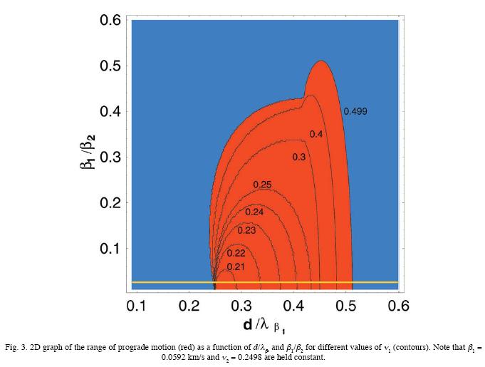 The red area in Figure 3 represents the region of prograde motion for our initial Texcoco model, as well as for the lower Poisson's ratios in the layer. The figure was calculated with the ContourPlot command of MATHEMATICA® and it may contain some random numerical noise.