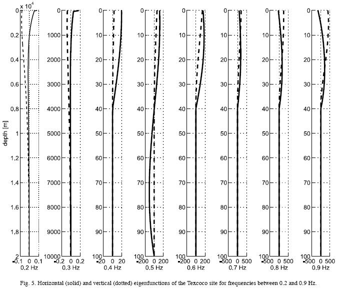 The synthetic theoretical seismograms in this paper are computed for a single force, excited by a Ricker impulse of first order, applied to the surface of the halfspace. It is useful to consider the eigenfunctions of the Texcoco site as defined in Table 1. We plot some eigenfunctions in the relevant frequency range (Figure 5). For different frequencies the horizontal (solid) and vertical (dotted) eigenfunctions are presented. Note that for frequencies higher than the site frequency β1/4d the top layer is a waveguide.