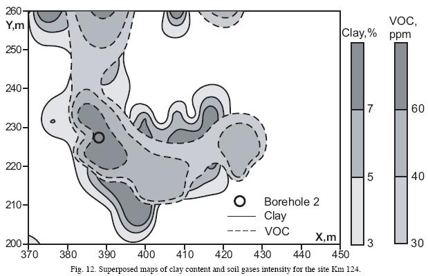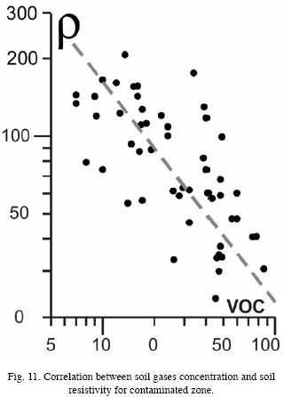 Two months before resistivity survey at the Km124 site, measurements of soil gases were performed to detect concentrations of volatile organic compounds (VOC). Soil resistivity and VOC values have correlation coefficient 0.62 and their dispersion is shown in Figure 11. When VOC increasing (reflecting growth of contamination grade) resistivity decreasing about 5 times.