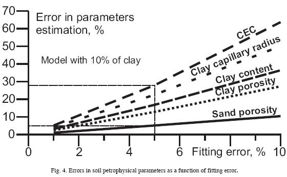 In Figure 4 there are graphs of errors in soil PP estimation as a function of fitting error for the case of soil samples measured in laboratory. Fitting error is the RMS error between experimental and theoretical ρ(C) curves. Errors were estimated with the help of statistical approach, developed by Goltsman (1971) and Tarantola (1994). Errors in clay content estimation are 617% when fitting error is 25%. Experimental studies of calibrated soils in laboratory gave us mean error in clay content estimation equal to 18% (Shevnin et al., 2006).