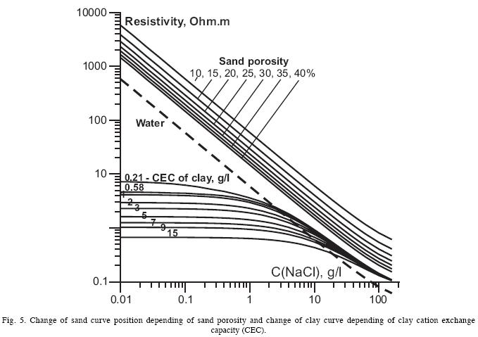 Theoretical curve for sand resistivity vs water salinity (Figure 3, curve 0) is practically straight line situated in parallel and above water resistivity curve. These curves decline of straight lines at high salinity (near solubility limit). The clay and claysand mixture curves at high salinity (more than 5 g/l) are situated in parallel to the lines for sand and water with distribution along vertical axis according to soil porosity. The curves for clay and claysand mixture for salinity less than 5 g/l are not in parallel to the lines for sand and water, cross water curve and their vertical distribution depends on clay content. Such nonlinear behavior of the curves for clay rich soil resulted in clay EDL and CEC influence.
