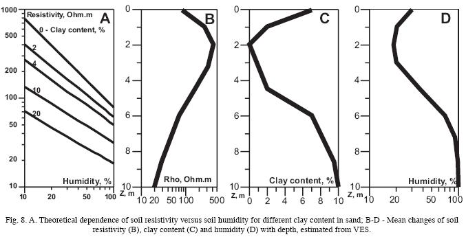 Site Km124 was contaminated as a result of a spill from the pipeline. This site is in sandy soil with low clay content (<10%). Groundwater level, at the moment of the resistivity study was at a depth of 2.5 m, but it changes from 1 to 4 m deep due to annual changes in precipitation, as well as the influence of a pond nearby and the high hydraulic conductivity of the soil. As a result, contaminated soil smeared with oil was found in a depth interval from 1 to 3 m. The main problem with VES data from this site was interpretation of soil resistivity and groundwater salinity in terms of petrophysical parameters in conditions of vadose zone (incomplete water saturation) with noticeable changes of humidity. To perform this operation, soil samples were collected in different parts of the site and clay content and CEC were found by means of laboratory measurements of resistivity vs salinity curves and its interpretation. Clay content was below 10%. Then theoretical dependencies of soil resistivity from clay content and humidity were calculated (Figure 8A) by using Ryjov's algorithm (Ryjov and Sudoplatov, 1990). After 2D interpretation of the VES data, the mean soil resistivity distribution (Figure 8B) and then clay content and humidity distribution with depth (Figures 8C, 8D) were found.