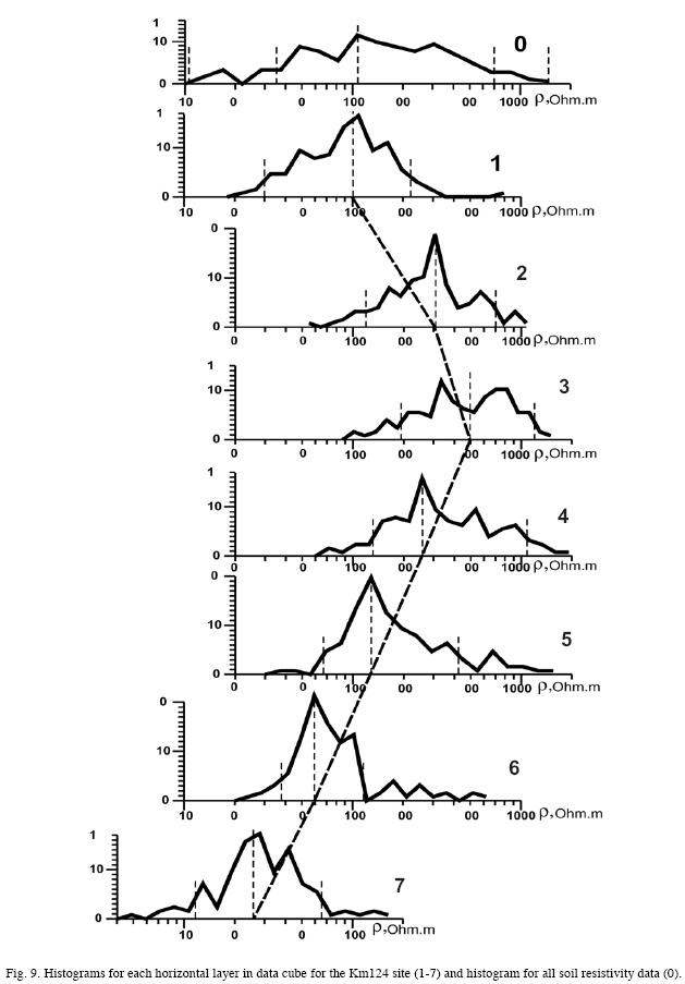 Traditional result of 1D interpretation is a horizontally layered model with layers spreading infinitely in lateral directions. Nevertheless during nearly one century 1D results were used to study 2D and 3D geological structures on a grid of VES. 2D interpretation gives more stable geological results along each profile and it can be also used to study 3D structures, especially in a situation with nearly horizontal layering. With some restrictions an assumption can be made that 2D interpretation gives information about some ρ(z) distribution (restricted volume instead of infinite horizontal prisms) below each VES point, all VES being distributed on the site area along profiles. In case of cells with vertical thickness 1 m, soil volume for resistivity determination amounts several cubic meters. These assumptions are suitable for pseudolayered models and allow creating a soil resistivity cube (Figure 2) (Shevnin et al., 2005a) for an easy preparation of vertical sections for any profiles and horizontal maps (lateral ρ changes) for some fixed depths.