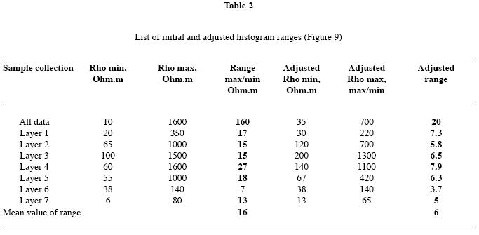 Which is the best form of VES data visualization, through sections or maps? Visualization in sections has less interpolation distance between measuring points. To create maps a distant interpolation between profiles is necessary. However maps have lower resistivity range than sections (electrical properties change more with depth than in plan) (Figure 9). As a result in maps visualization a higher resolution can be reached with the possibility of some weaker anomalies locating. To adjust resistivity range a statistical analysis was applied, allowing to increase visualization resolution (Figure 9, Table 2) and scale range. Without special adjustment of resistivity range it is frequently not possible to locate oil contamination anomalies on sections and maps. In case of aged contamination resistivity ratio between clean and contaminated soil is from 2 to 5. To locate contamination anomaly, maximum resolution of visual presentation is needed and it is easier to obtain in case of maps. Both sections and maps help us to have an idea of contamination distribution in space.