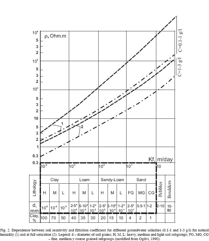 2. Filtration coefficient is related to different soil parameters. Among these, in our opinion, clay content is correlated with filtration coefficient. Clay content estimation with the technology of VES survey on true resistivity, obtained from VES interpretation, groundwater salinity estimation (obtained in the field on groundwater resistivity) and soil model from soil measurements (resistivity versus pore water salinity) in laboratory, should take into account groundwater salinity and soil humidity as factors of high influence on soil resistivity.