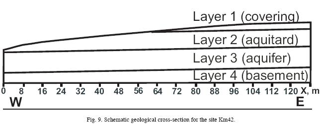 There are three crosssections for the same profile of the site in Figure 10: resistivity crosssection obtained after 2D VES data interpretation, crosssections of clay content and filtration coefficient. On these crosssections it is possible to distinguish four layers from values of resistivity, clay content and filtration coefficient. The main sandy aquifer (the 3rd layer) is clearly visible from its maximum resistivity, minimum clay content and high values of filtration coefficient.