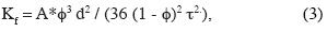 is a tortuosity; A is a constant depending on the units: A=0.92*108 for d in mm and Kf in m/d. Kozeny formula can be applied to sandclay soil. Hydraulic conductivity is a function of soil porosity, capillary radii and tortuosity. These three parameters are not completely independent; for example, we can calculate tortuosity with the help of formula (5) using soil porosity Φ and formation factor F (Bassiouni, 1994):