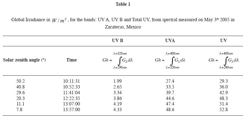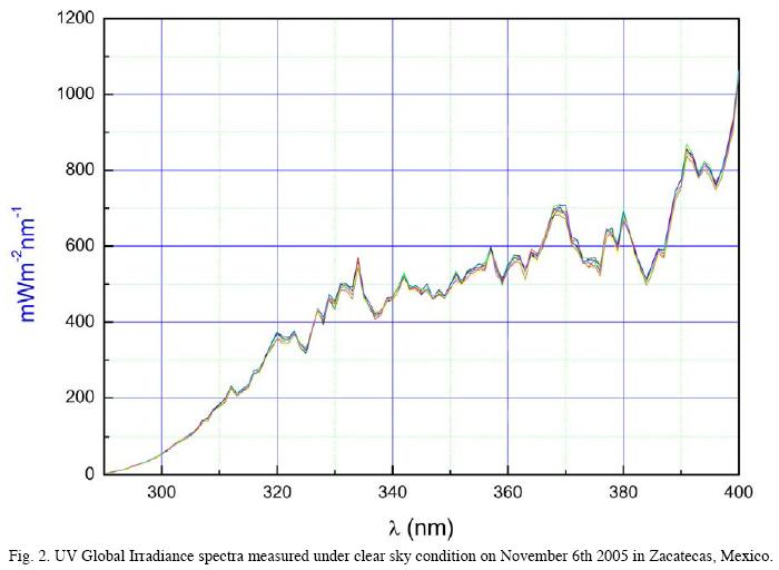 A significant remark is that wavelengths under to 300 nm are observed in the spectrum of UV irradiance in Zacatecas, which correspond to a more energetic spectral zone. This may be a relevant characteristic in the case of solar irradiance in the tropics, that is, with a higher proportion of UVB irradiance in relation to that found at higher altitudes.