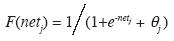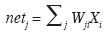 where Xi is the input activation from unit i and Wji is the weight connecting unit i to unit j. However, instead of calculating a binary output, the net input is added to the unit's bias θ and the resulting value is passed through a sigmoid function