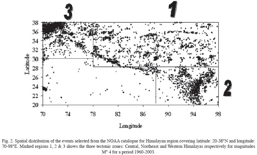 The whole of Himalayas covering 2038° N and 7098° E (Teotia et al., 1997) is divided approximately into three zones: (i) Central Himalayas (2838° N latitude and 7898° E longitude) (ii) Northeast Himalayas (2028° N latitude and 8898° E longitude) (Gupta et al., 1986) and (iii) Western Himalayas (3038° N latitude and 7078° E longitude). The data used here are mainly from the NOAA and USGS earthquake catalogues complied for the period of 1960 to 2003 for magnitude M > 4 events. The monthly frequency data has been prepared for these three regions i.e. the number of events per month has been prepared from 1960 to 2003 (i. e. 44 years X 12 (as 1 year = 12 months) = 528 months or events. Figure 2 shows the spatial distribution of the earthquake events in the Himalayas in the three zones CH, NEH and WH respectively.