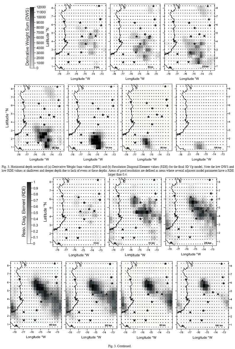 La estructura Vp sugiere la existencia de zonas de baja velocidad que subyacen en las regiones volcánicas. Un área de alta velocidad en el sector 77°W 4°N interrumpe las zonas de baja velocidad (rocas parcialmente fundidas) y parece responder a la presencia de una estructura anticlinal relacionada con el manto superior. Esta región de contrastes de velocidad marca el límite entre una subducción más inclinada hacia el norte con respecto al sector sur como respuesta al acople de la placa Caribe y del Bloque Chocó en el sector norte sobrelapandose sobre la placa Nazca.